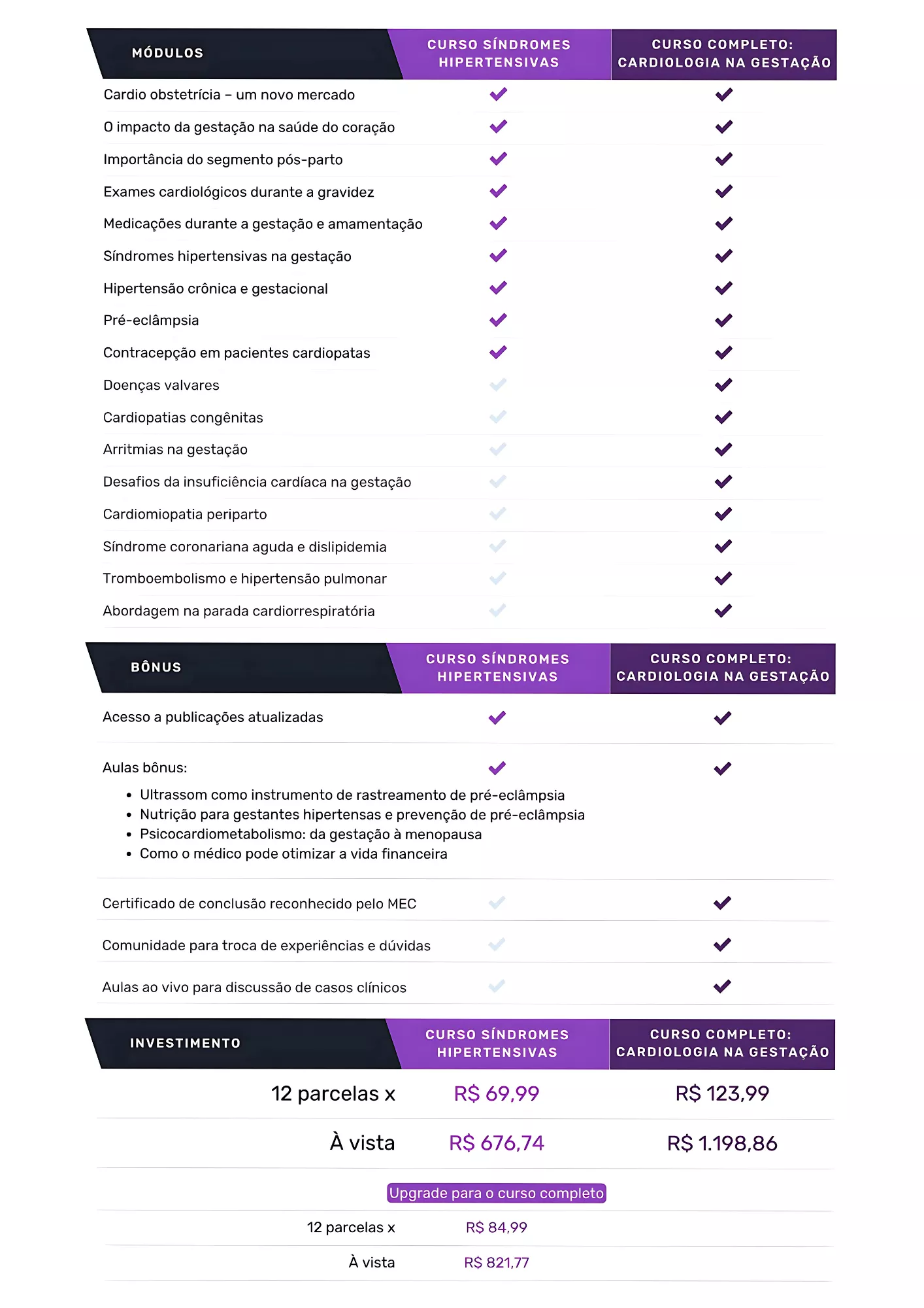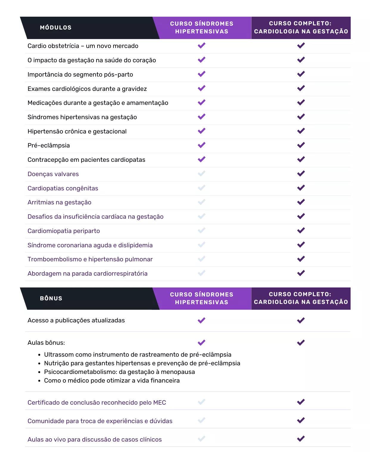 O curso Síndromes Hipertensivas foca no assunto mais prevalente da área enquanto o curso completo engloba, além das síndromes hipertensivas, as demais cardiopatias na gestação. O vídeo acima detalha as diferenças.